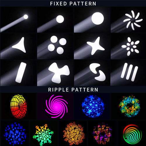 cố định: 10 hoa văn cố định + ánh sáng trắng, có hiệu ứng rung, hiệu ứng nước tiến và lùi