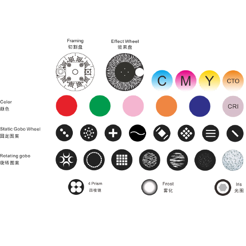 ·1 gobo cố định: 3 gobo cố định + 2 hiệu ứng mở + động