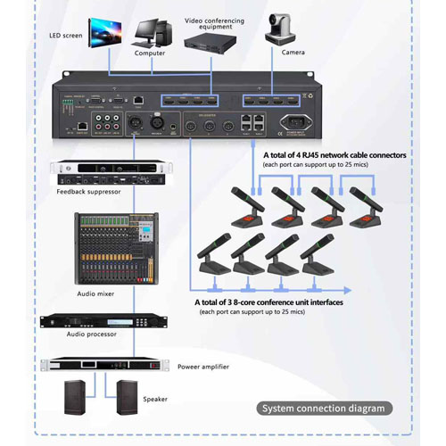 ◆ Số lượng đơn vị gắn tiêu chuẩn: Giao diện hàng không 8 lõi có thể kết nối tối đa 50 đơn vị hội nghị (máy chủ đến cáp mở rộng micrô trong vòng 30M), giao diện cáp mạng có thể kết nối tối đa ◆ Với 2 giao diện RS232, đầu PC và đầu điều khiển. Phía PC hỗ trợ chế độ họp điều khiển từ PC, giới hạn loa, điều chỉnh độ khuếch đại, chuyển đổi thiết bị, điều khiển camera, nhập và xuất dữ liệu cuộc họp, nhắc nhở ứng dụng phục vụ trà, chức năng đăng nhập