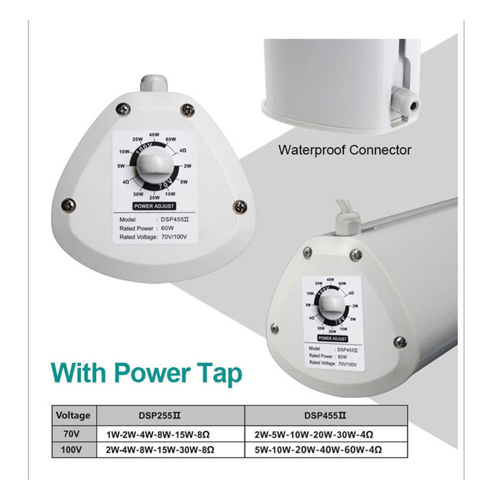 DSP255II là loa cột ngoài trời chống chịu thời tiết, tích hợp biến áp 70v/100v. Việc truyền tải 70v/100v được thực hiện ở chế độ điện áp cao, dòng điện thấp, cho phép truyền tải khoảng cách xa hơn và kết nối song song nhiều loa.